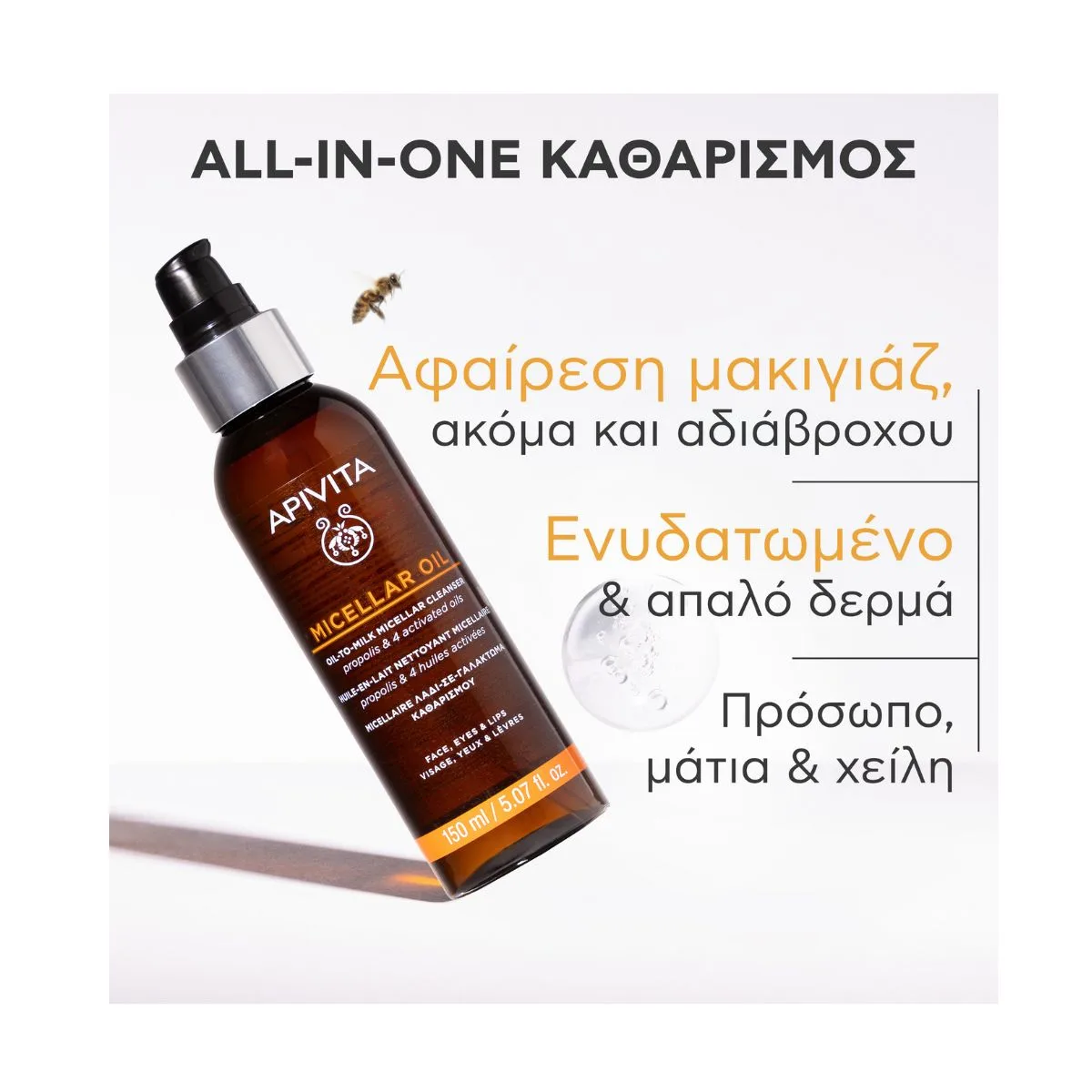 Το Apivita Micellar Oil to Milk Cleanser Face, Eyes & Lips είναι ένα ελαφρύ καθαριστικό λάδι σε γαλάκτωμα, που απομακρύνεται εύκολα με νερό και αφήνει απαλό, μη λιπαρό τελείωμα στην επιδερμίδα.