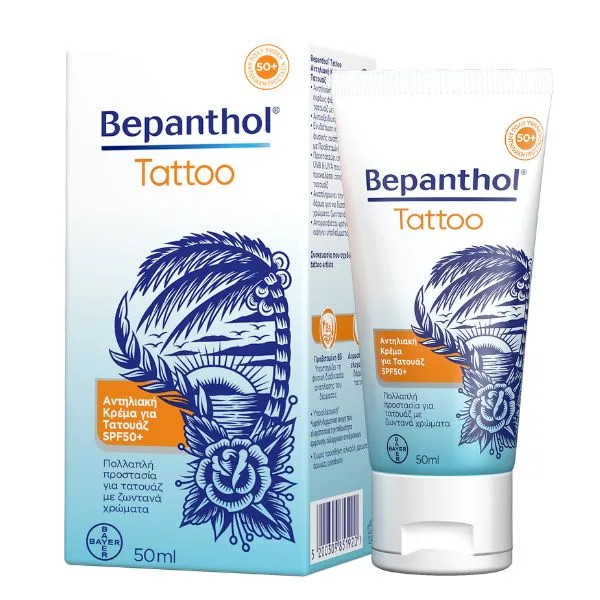 Η Bepanthol Tattoo Αντηλιακή Κρέμα για Τατουάζ SPF50+ προσφέρει πoλλαπλή προστασία για τα tattoos, ώστε να διατηρούνται τα χρώματα ζωντανά και το δέρμα ενυδατωμένο!
