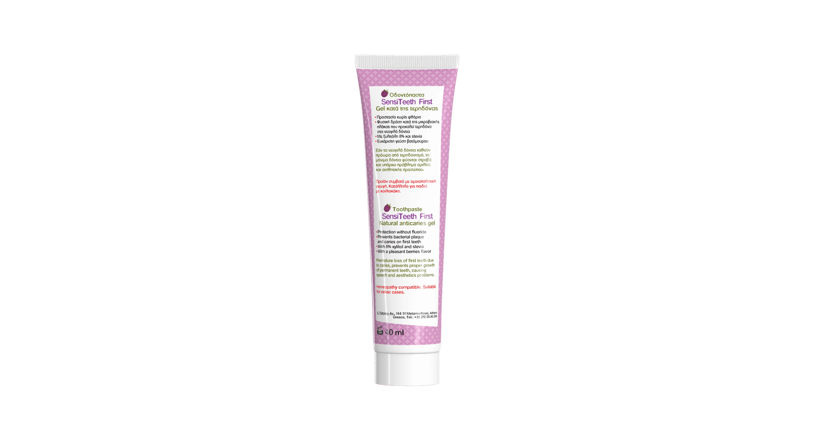 Οδοντόκρεμα για την πρώτη οδοντοφυΐα, για βρέφη από 6 μηνών έως παιδιά 3 ετών. Η σύνθεση της απαλή και ασφαλή για τον στοματικό βλεννογόνο, προστατεύει τα πρώτα δοντάκια από την τερηδόνα και την δημιουργία πλάκας, και το στόμα από την ανάπτυξη μικροβίων, ενώ σέβεται τη φυσιολογία των ούλων. Με καταπληκτική γεύση βατόμουρου.