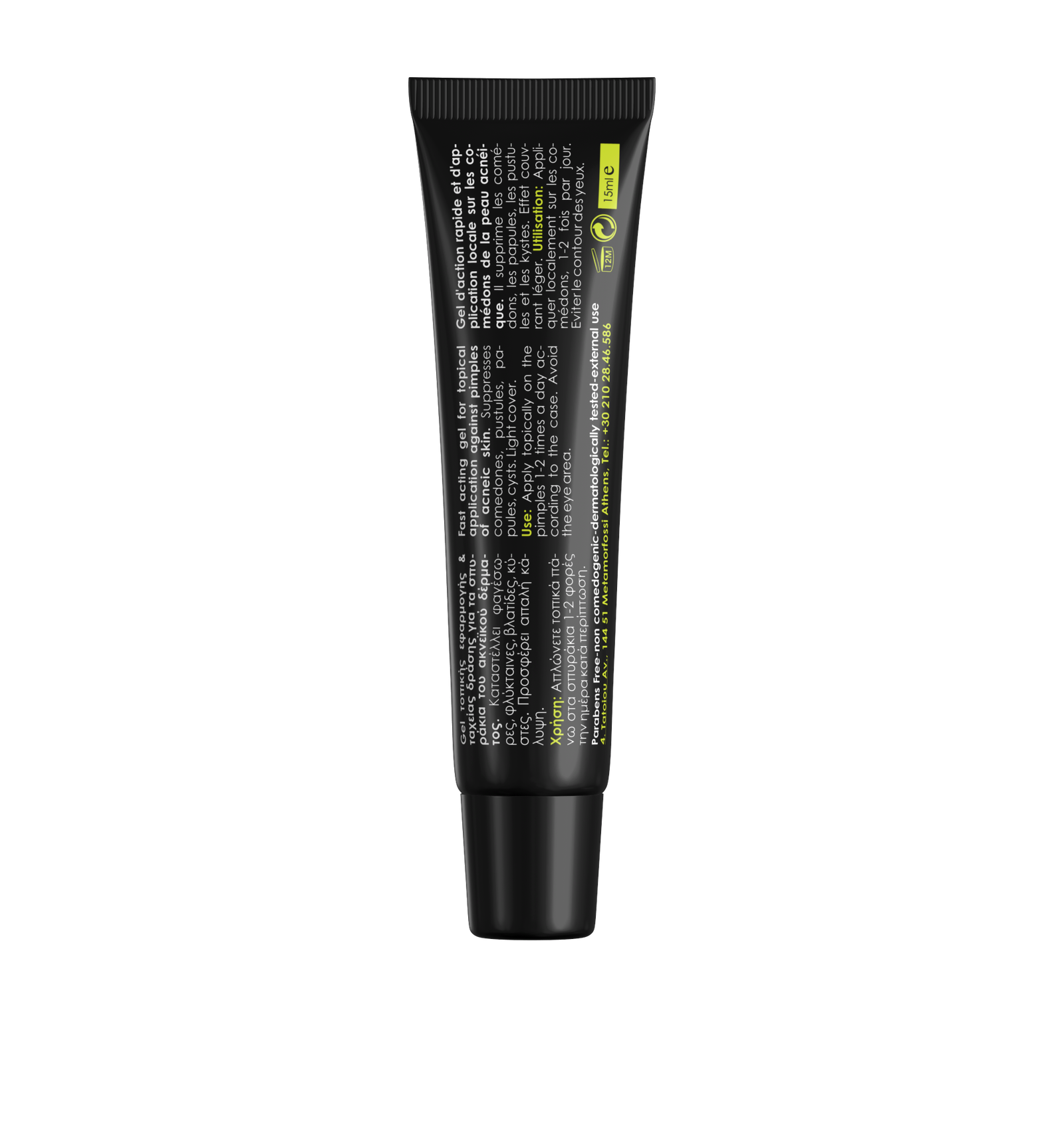 Έγχρωμο τζελ ταχείας δράσης για εφαρμογή πάνω στα σπυράκια. Προσφέρει απολέπιση και διάνοιξη του πόρου, παρέχει βακτηριακή προστασία, ρυθμίζει την έκκριση σμήγματος και καλύπτει τις κοκκινίλες και τις δυσχρωμίες.
