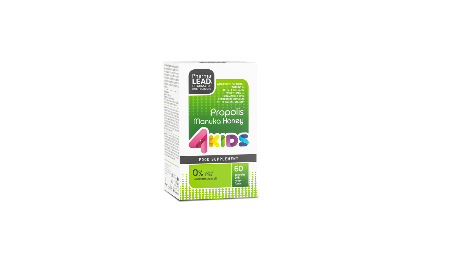 Τα ζελεδάκια Pharmalead Propolis Manuka Honey 4Kids περιέχουν τιτλοδοτημένο εκχύλισμα πρόπολης, εκχύλισμα κισσού και αλθαίας καθώς και βιταμίνη C, βιταμίνη D3 και ψευδάργυρο. Οι βιταμίνες C και D καθώς και ο ψευδάργυρος συμβάλλουν στην φυσιολογική λειτουργία του ανοσοποιητικού συστήματος. Η βιταμίνη D επιπλέον συμβάλλει στη διατήρηση της φυσιολογικής κατάστασης των οστών και των δοντιών ενώ ο ψευδάργυρος συμβάλλει στη φυσιολογική γνωσιακή λειτουργία (Ευρωπαϊκός Κανονισμός 432/2012).
